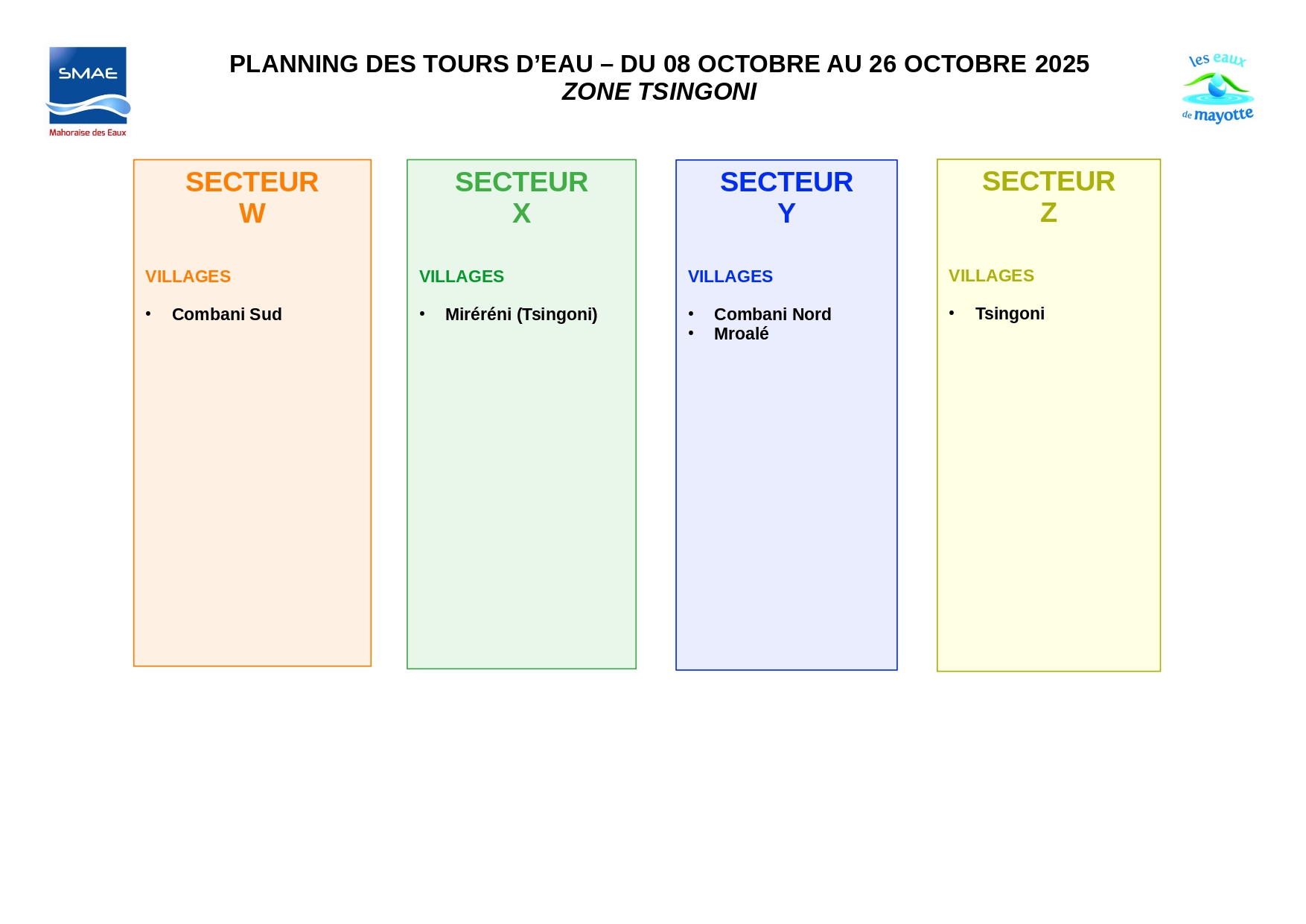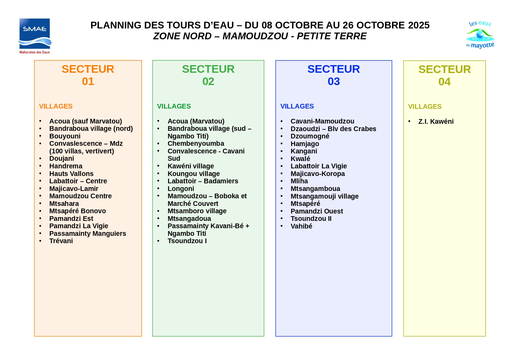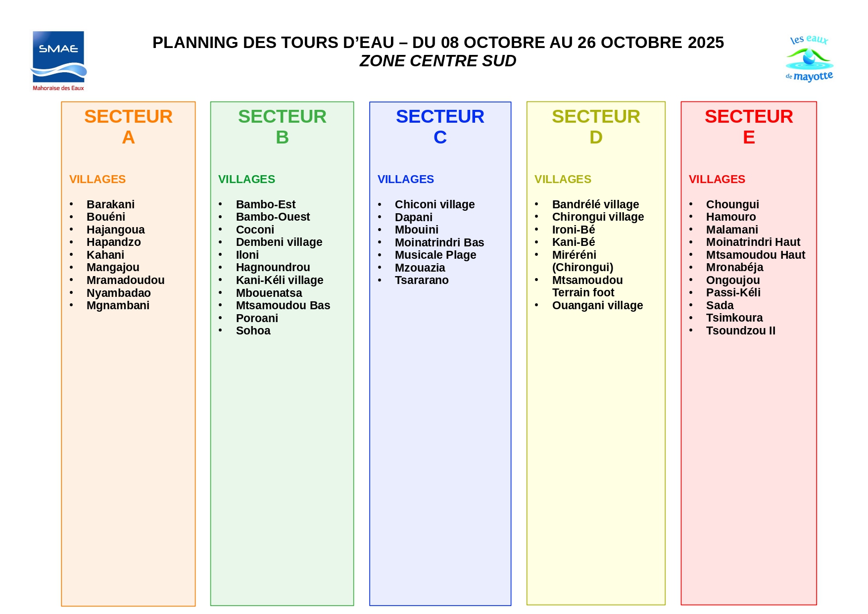 Pour mettre en place ce nouveau dispositif, une réorganisation des secteurs de distribution est nécessaire, indique la SMAE. Les communes du centre-sud passeront des secteurs 1, 2, 3 ou 4 aux secteurs A, B, C, D, E. La commune de Tsingoni sera répartie en secteurs W, X, Y et Z. Les autres communes conserveront leurs secteurs actuels.