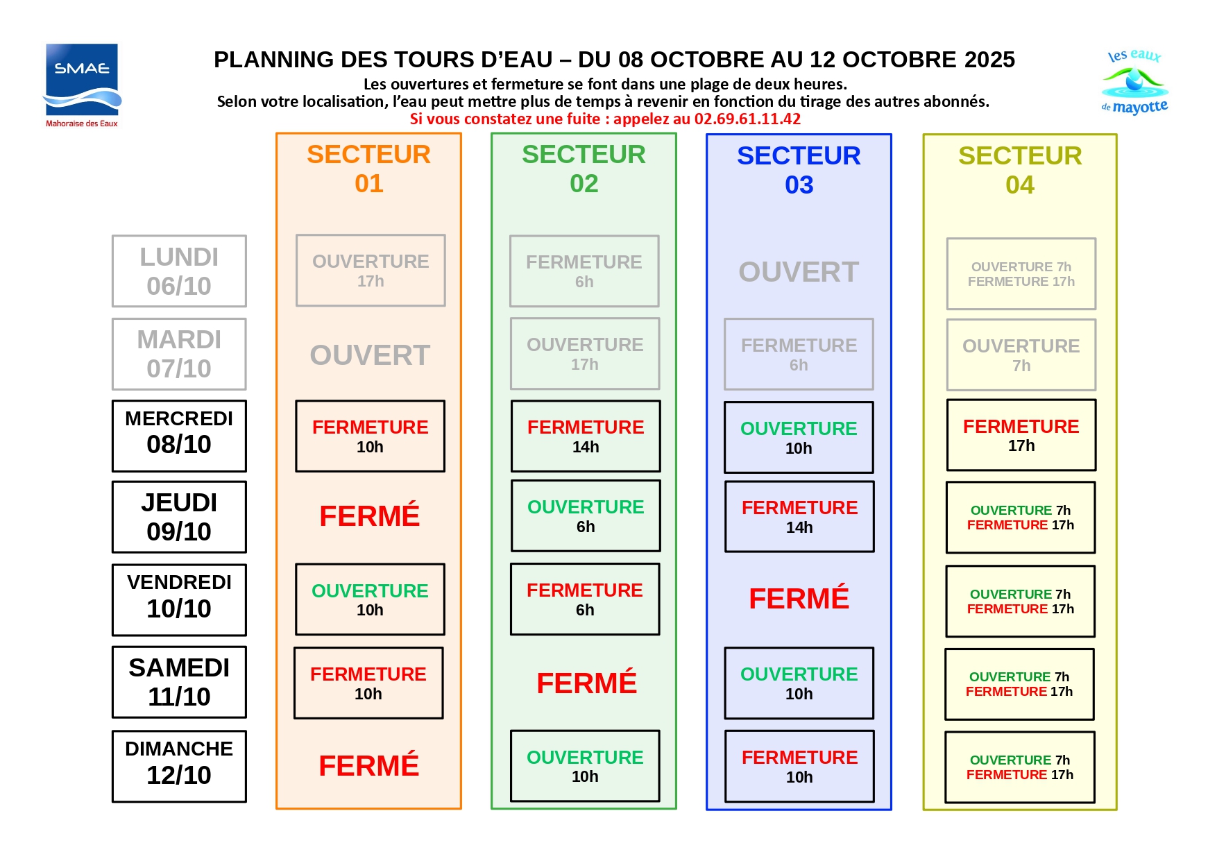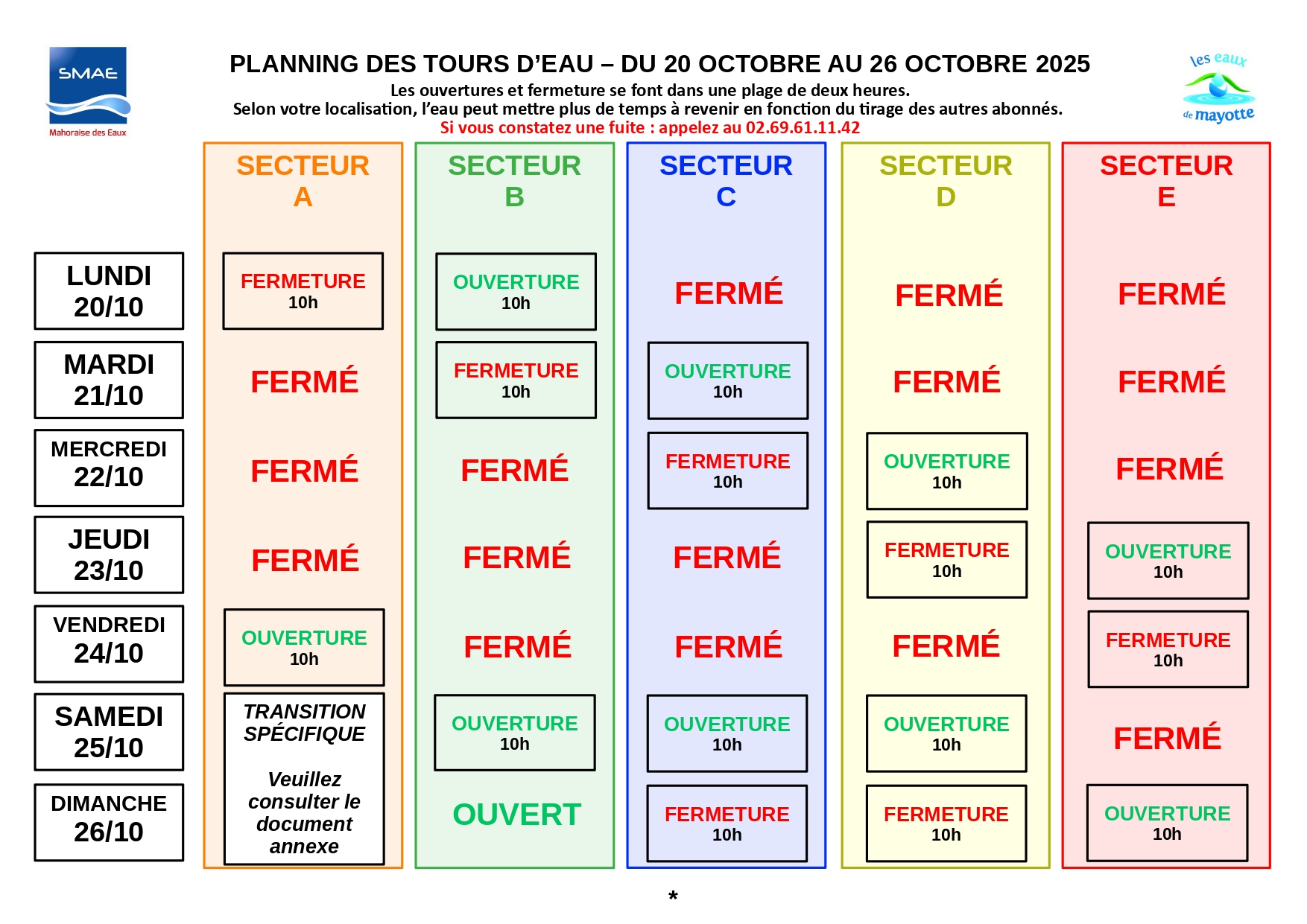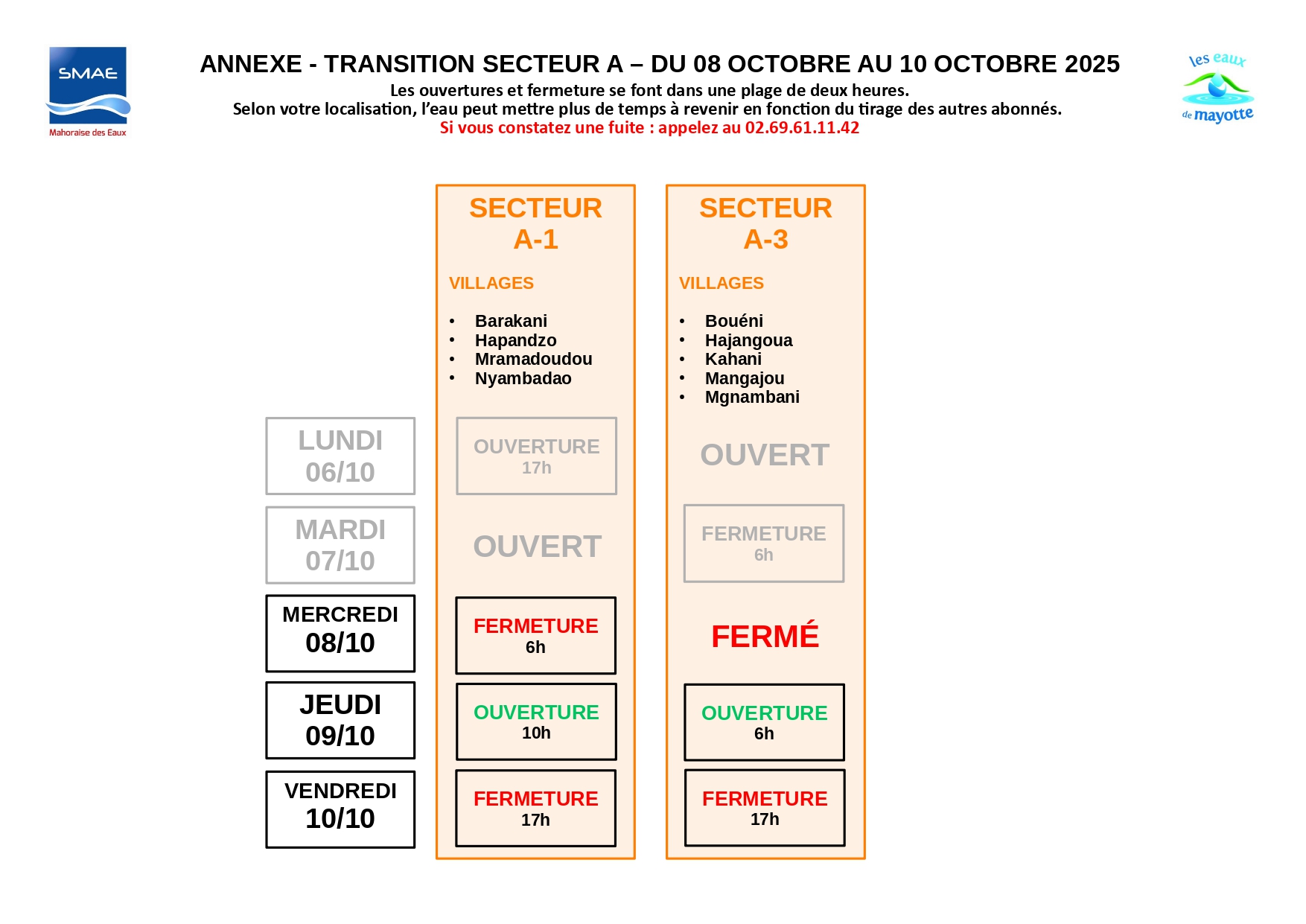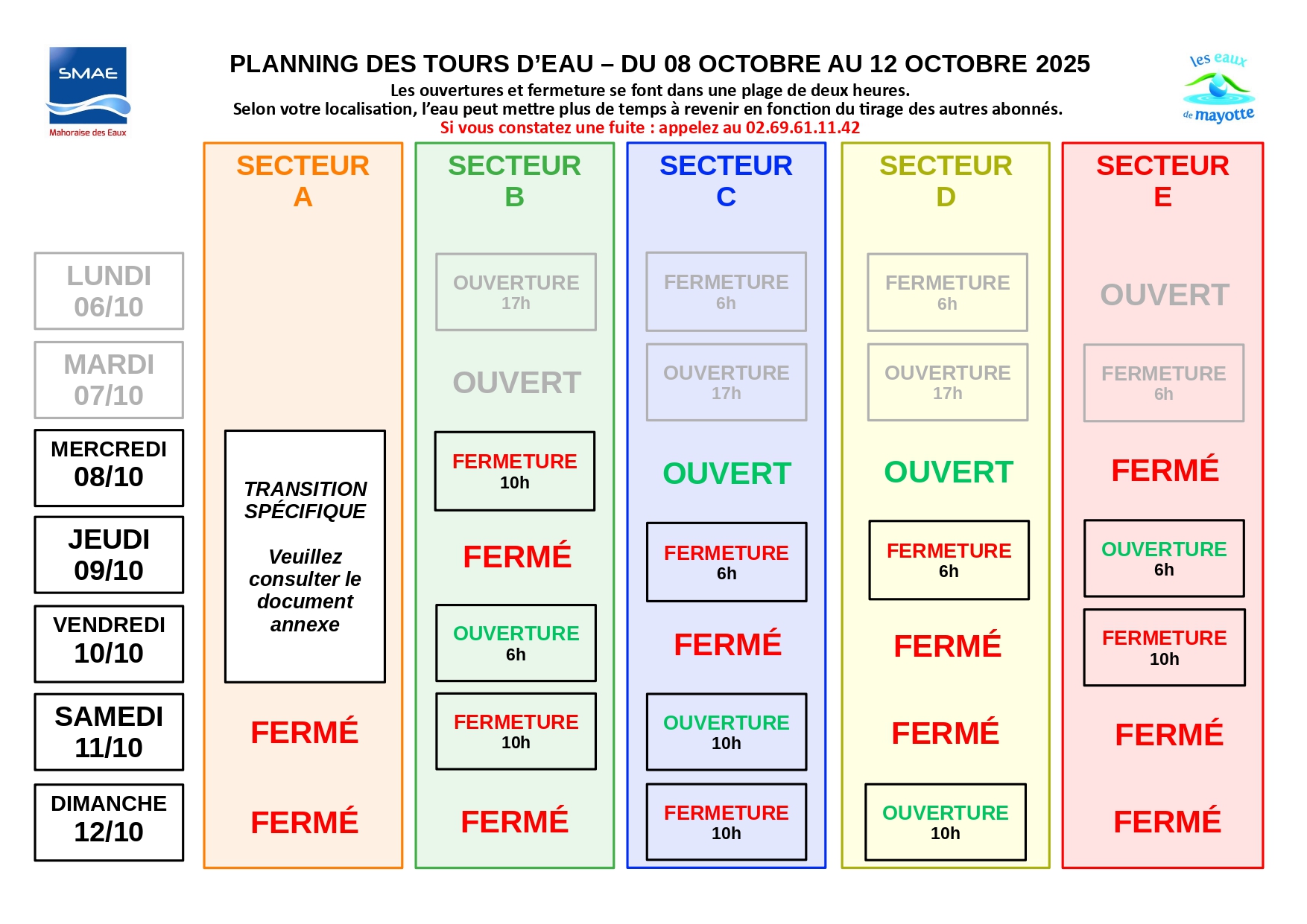 « Les abonnés sont invités à consulter le planning joint ou disponible sur le site internet de la SMAE afin de connaître leur nouveau secteur et les horaires de distribution correspondants. Une période de transition est prévue : dès le 8 octobre pour atteindre le rythme défini à partir du 11 octobre, puis du 24 au 26 octobre pour revenir progressivement au calendrier habituel. Les abonnés sont donc appelés à rester attentifs aux horaires d’alimentation pendant ces phases d’ajustement ».