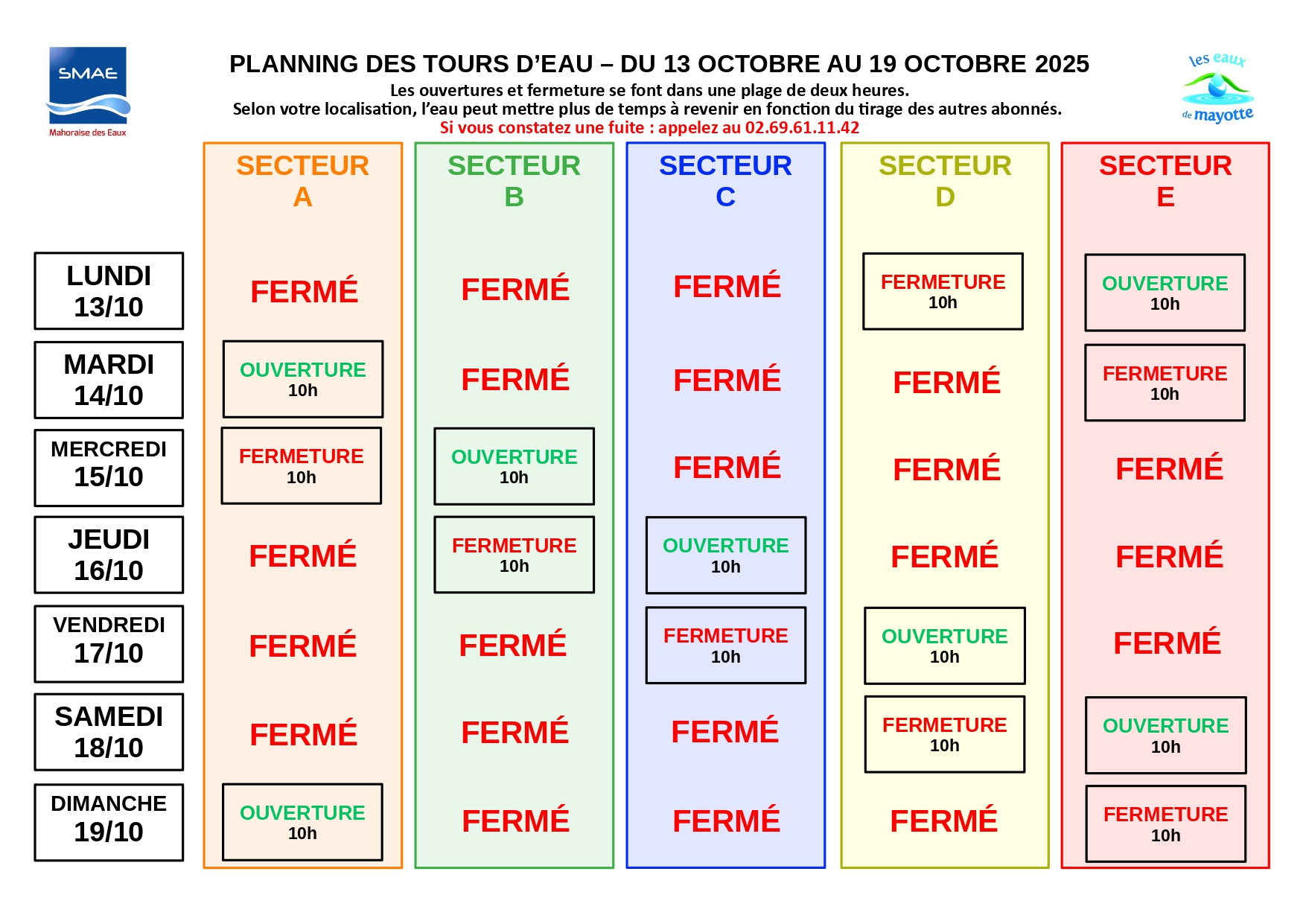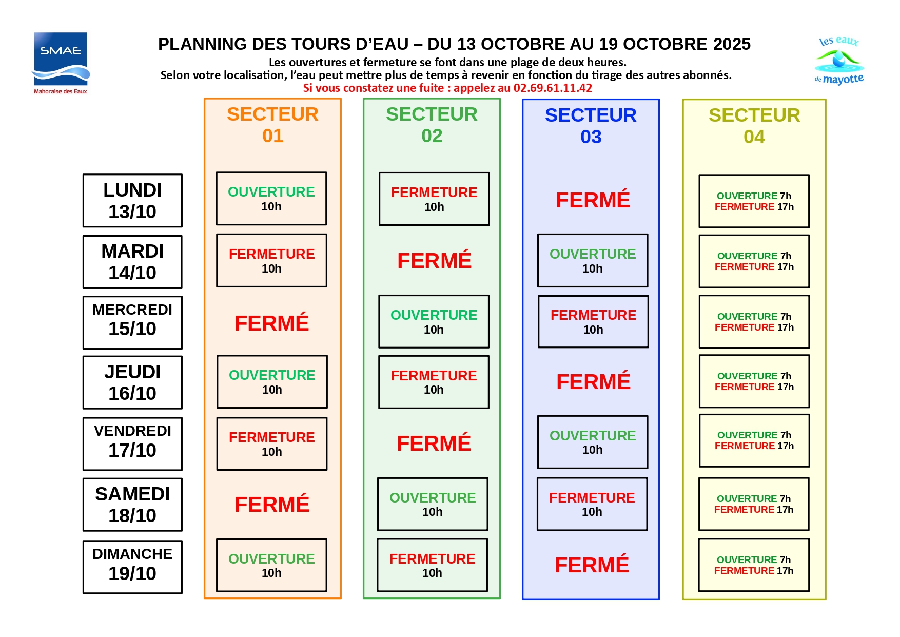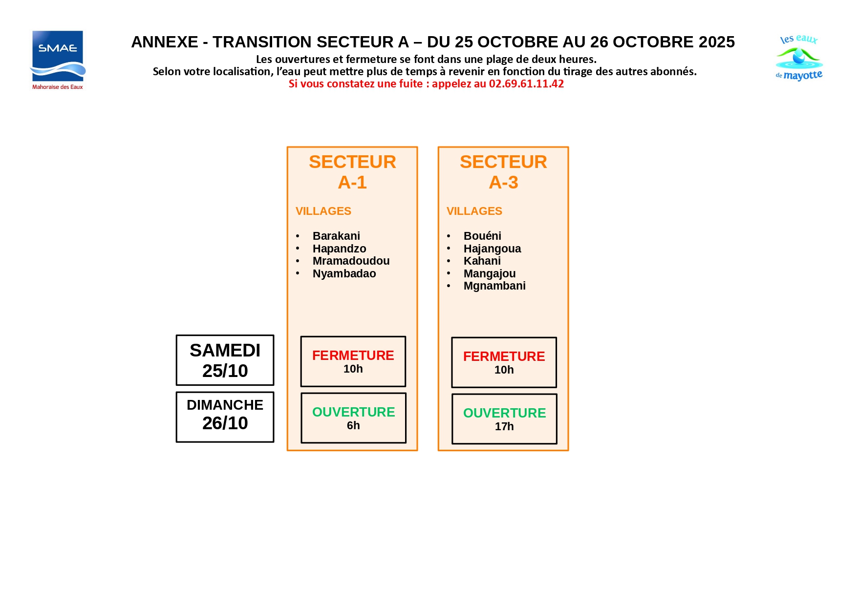 « Les abonnés sont invités à consulter le planning joint ou disponible sur le site internet de la SMAE afin de connaître leur nouveau secteur et les horaires de distribution correspondants. Une période de transition est prévue : dès le 8 octobre pour atteindre le rythme défini à partir du 11 octobre, puis du 24 au 26 octobre pour revenir progressivement au calendrier habituel. Les abonnés sont donc appelés à rester attentifs aux horaires d’alimentation pendant ces phases d’ajustement ».