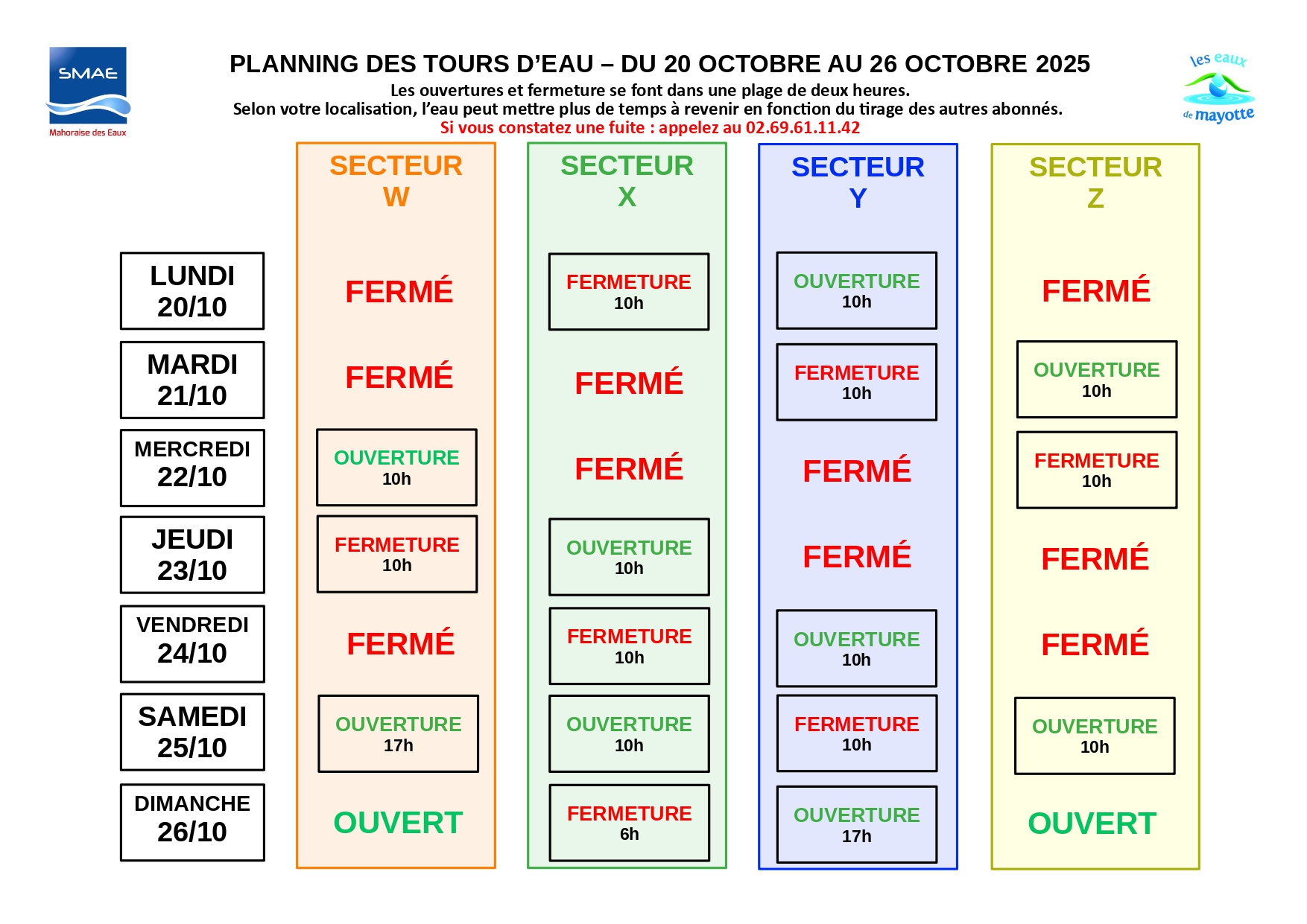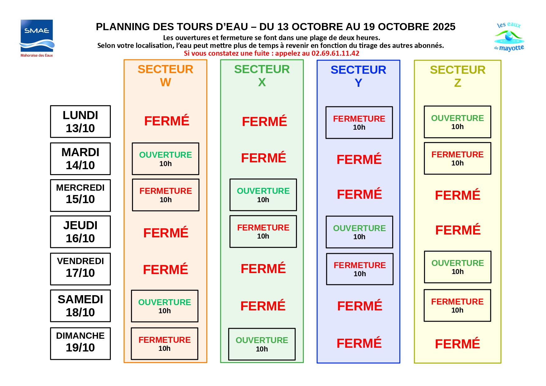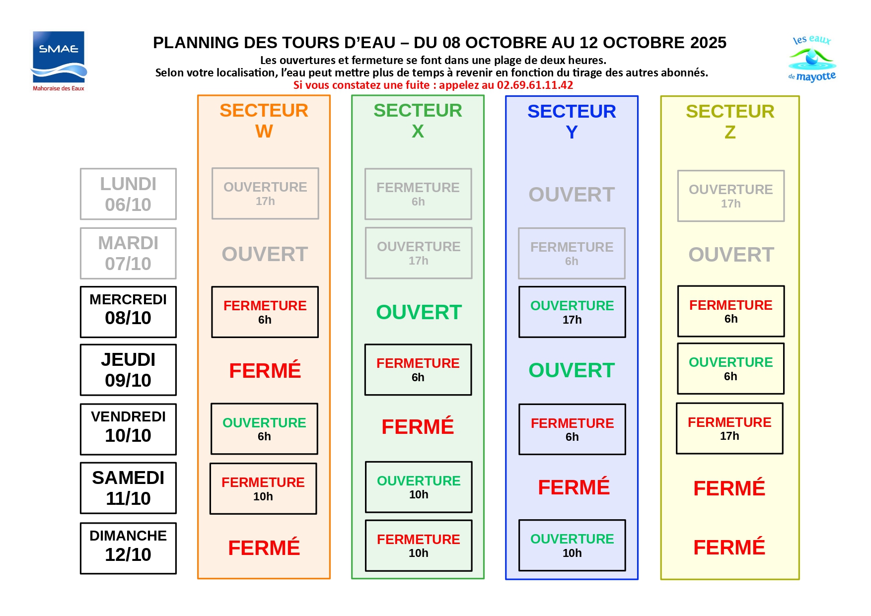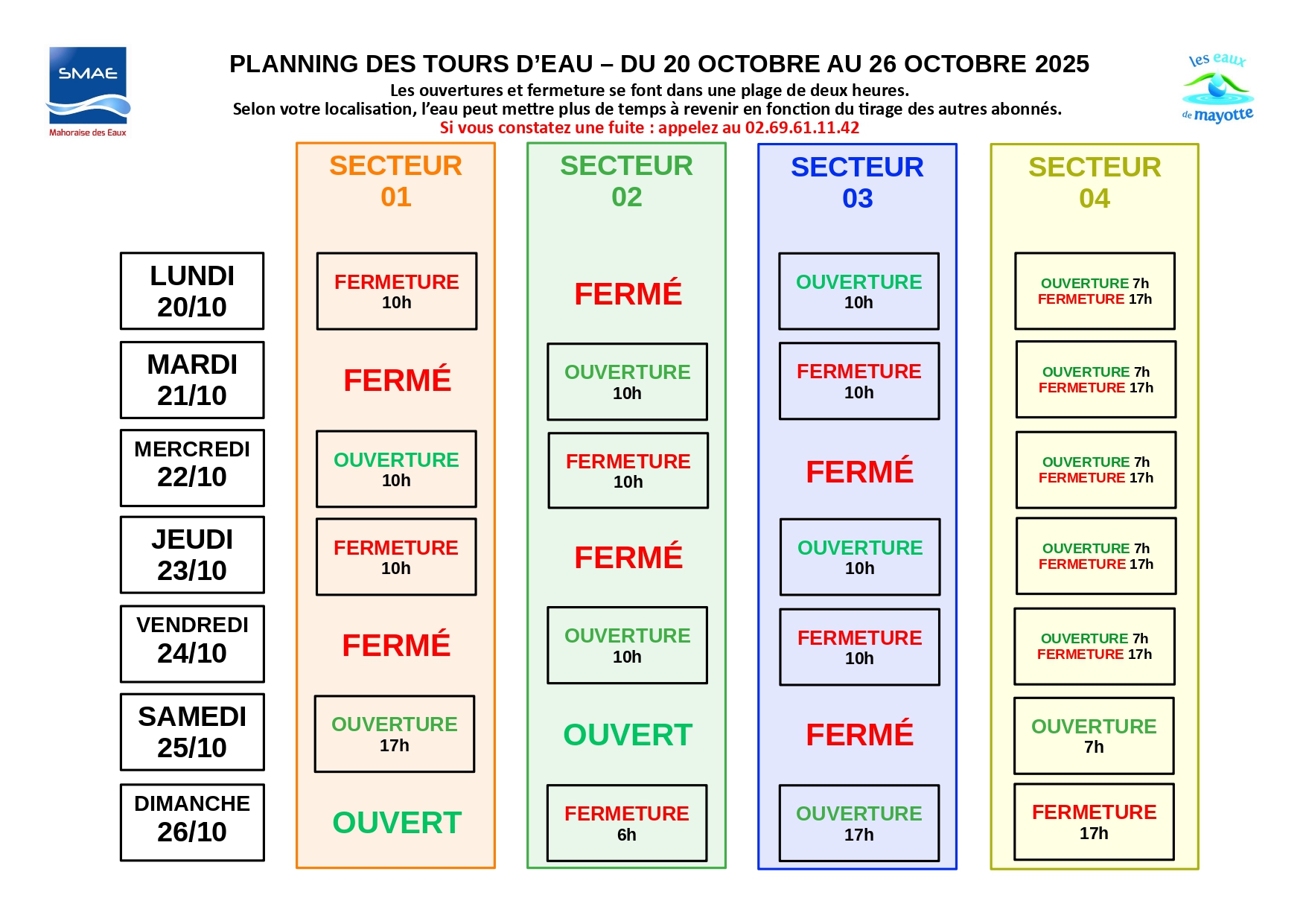 « Les abonnés sont invités à consulter le planning joint ou disponible sur le site internet de la SMAE afin de connaître leur nouveau secteur et les horaires de distribution correspondants. Une période de transition est prévue : dès le 8 octobre pour atteindre le rythme défini à partir du 11 octobre, puis du 24 au 26 octobre pour revenir progressivement au calendrier habituel. Les abonnés sont donc appelés à rester attentifs aux horaires d’alimentation pendant ces phases d’ajustement ».