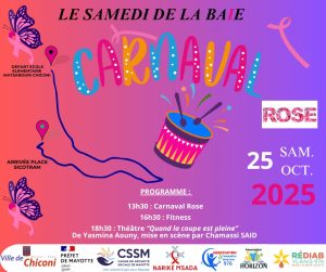 – Carnaval rose de 13h30 à 16h30 : départ prévu à l’école élémentaire Matsabouri : tous en rose pour soutenir la lutte contre le cancer du tous, c’est l’affaire de TOUS.