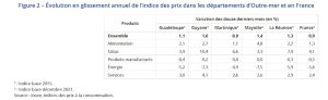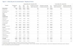 A Mayotte, l’inflation sur un an est supérieure au niveau national (+0,9 %). Les prix de l’alimentation, des services et du tabac croissent et ceux de l’énergie reculent sensiblement. Les prix de l’alimentation quant à eux augmentent davantage (+4,8 %) qu’au niveau national (+1,3 %). Quand on sait que l’alimentaire pèse pour 24 % dans la consommation des ménages à Mayotte cela impact fortement le pouvoir d’achat des Mahorais.