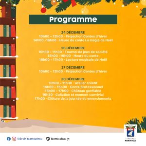 À l’occasion des fêtes de fin d’année, la médiathèque Rama M’sa propose un programme d’animations autour de la lecture, des contes et d’activités de Noël.