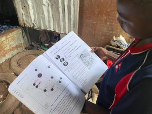 Abel, 14 ans, avec son cahier. Comme lui, beaucoup d’enfants du quartier sont scolarisés à Passamaïnty, les familles craignent une rupture de leur éducation.