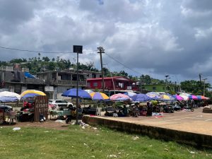 Les marchandes de fruits et légumes sont nombreuses sur le marché le long de la route nationale. Des mères emmènent leurs enfants en bas âge auprès de la PMI mobile de l’ARS dans le parc, tandis que des hommes se rendent à la mosquée ou profitent de l’ombre assis sur des bancs. Malgré ce semblant de quotidien, une certaine tension flotte dans l’air et la place du village apparaît anormalement vide.